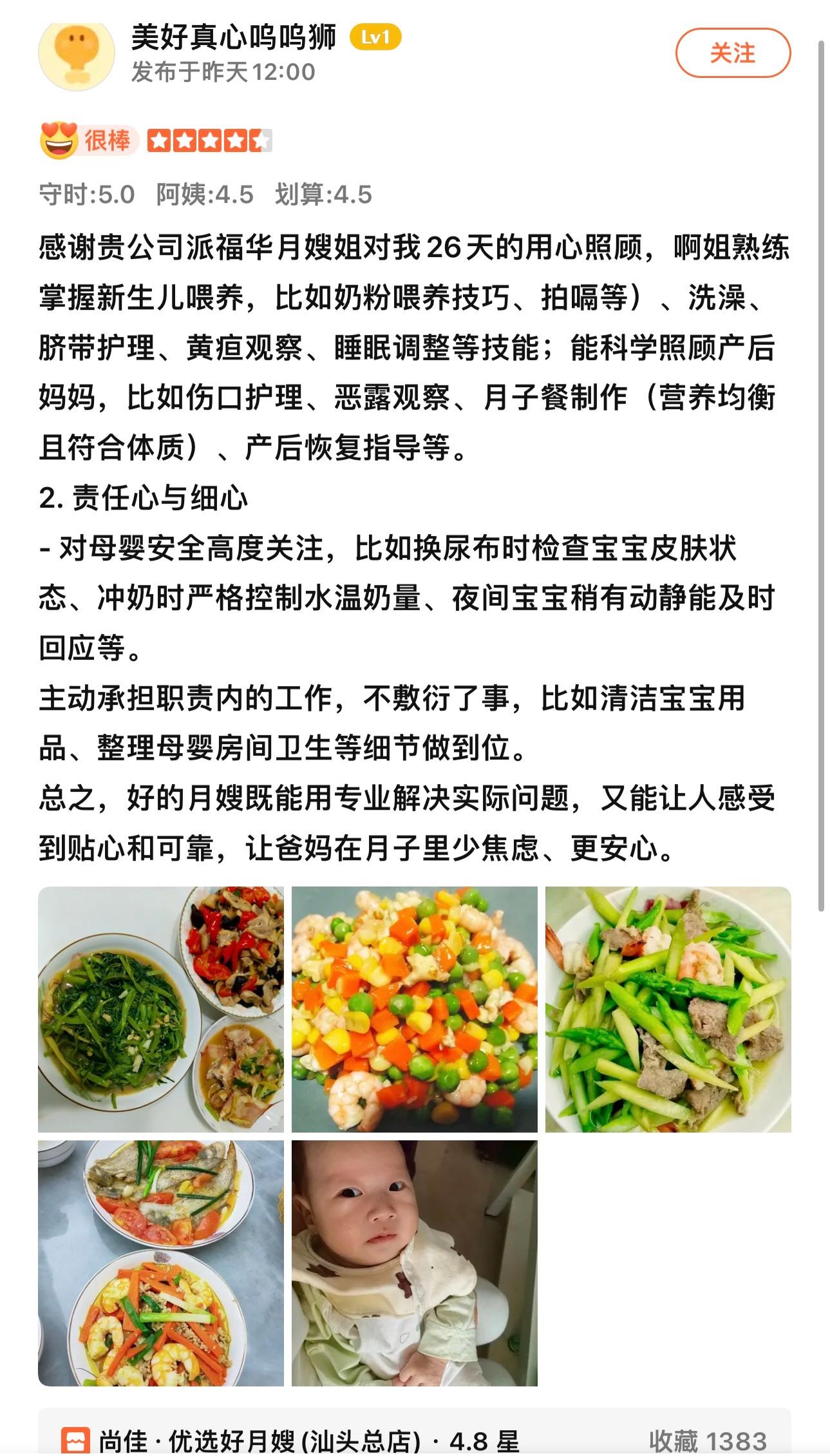 華姐性格開朗大方,以誠待人。她在月子期間工作認真負責,手腳非常勤快利落。她把寶寶和寶媽都照顧得很細致,每天都不厭其煩地悉心照料寶寶和寶媽的生活飲食起居,和客戶家里人也是友好相處。