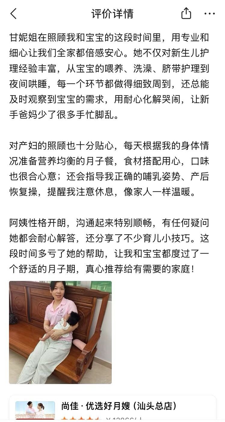 甘妮是來自廣西性格溫和,開朗大方,親和力強(qiáng),做事細(xì)膩,擅長寶寶的五大行為訓(xùn)練,被動操,排氣操,并幫助寶寶建立良好的生活習(xí)慣。媽媽護(hù)理方面擅長處理生理性漲乳,惡露觀察,身體放松,心情疏導(dǎo),她做飯很好吃,擅長潮汕菜級燉湯,科學(xué)搭配月子餐(三餐三點(diǎn))。選擇她,一定會讓您過一個舒心愉快的月子。