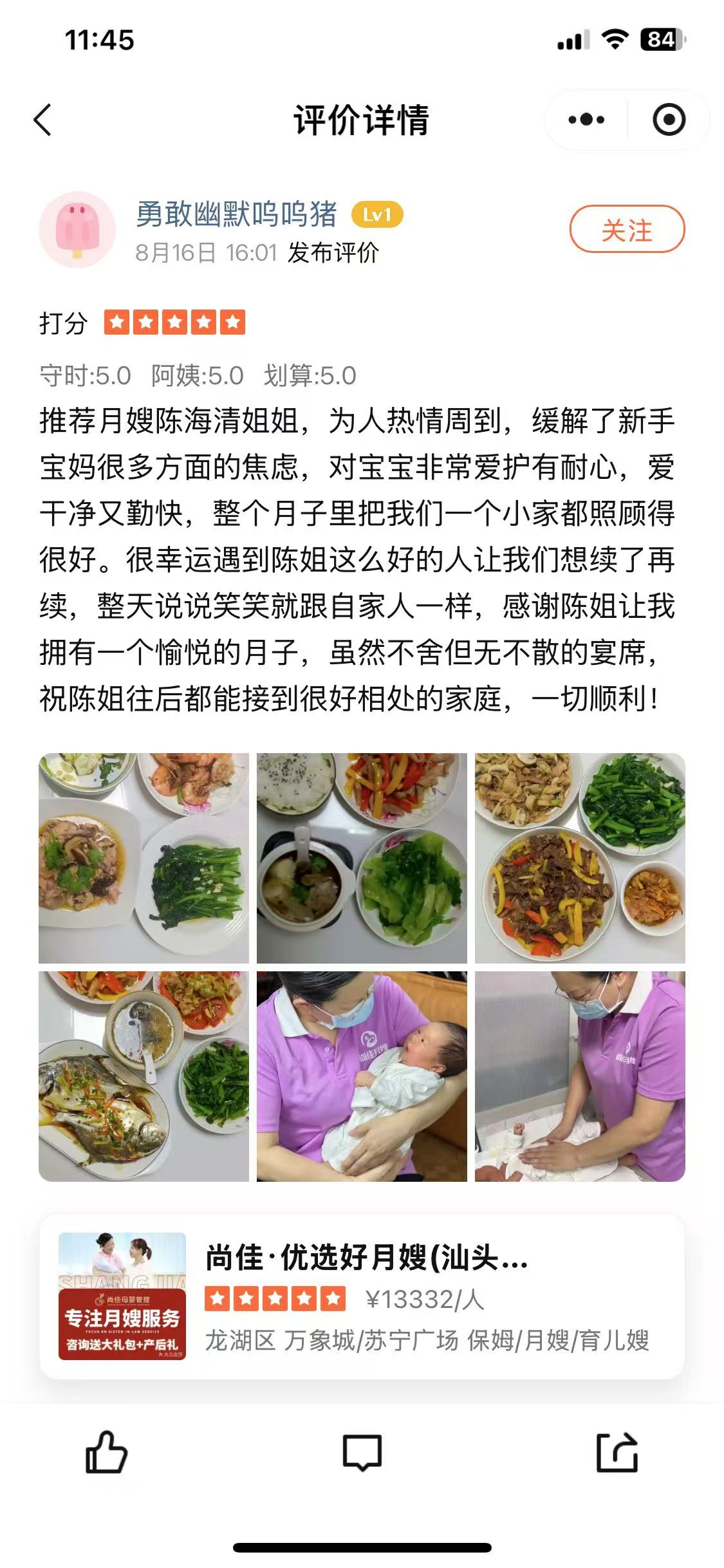 陳姐來自廣西, 性格比較開朗,善于溝通。從事月嫂工作以來得到很多服務過的家庭的認可,并獲得好評,錦旗,她平時做事認真負責,對于母嬰護理工作有豐富的經(jīng)驗,同時具有良好的服務意識和科學育嬰方法,擅長乳房護理,新生兒臍部,臀部護理以及新生兒常見狀況觀察和處理,盡心盡責似家人,盡心呵護小寶寶,這也是顧客給予她的服務評價,也是她從事月嫂工作一直秉持的服務態(tài)度,希望她能用她的專業(yè)技能為您和您的寶寶度過一個幸福美滿的產(chǎn)褥期!