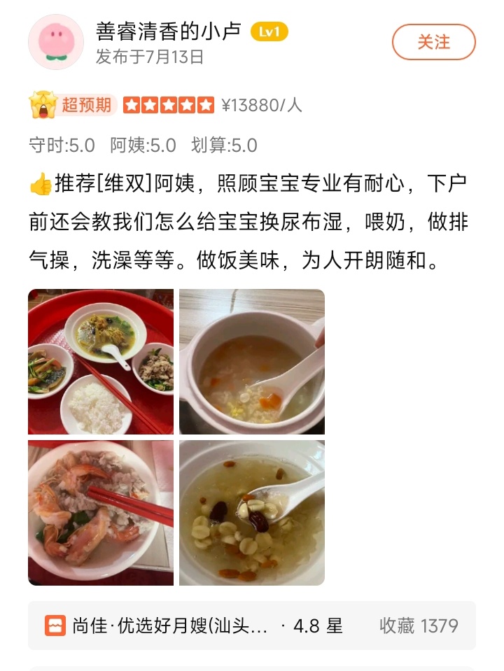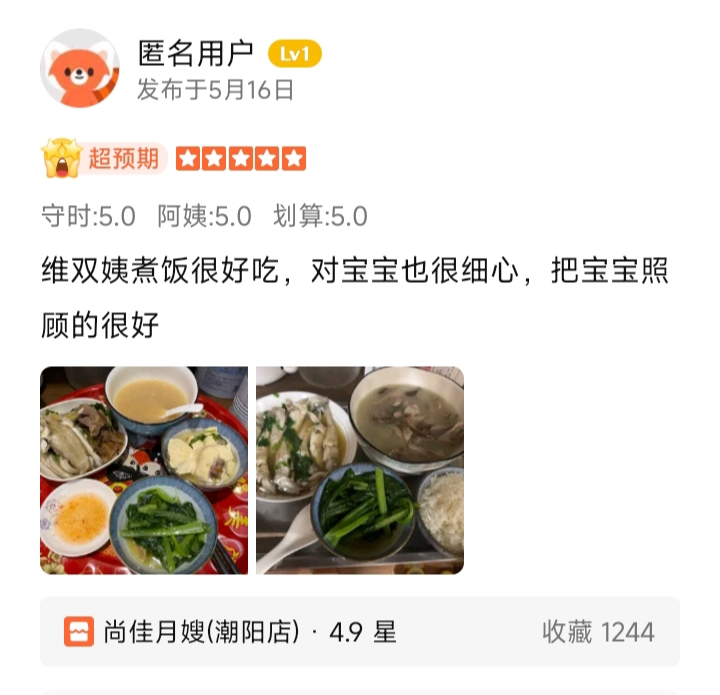 雙姐來自饒平,為人老實(shí),不善言詞,外表干凈利落,在護(hù)理新生兒方面很細(xì)心,洗澡、撫觸、排氣操都很熟練、耐心,也很注重跟寶寶的互動,進(jìn)行聽覺視覺的開發(fā),調(diào)整寶寶的作息時間,注意細(xì)節(jié),觀察寶寶皮膚、氣色、大小二便跟動態(tài),預(yù)防紅臀、熱疹,及時控制濕疹、黃疸,讓寶寶健康成長;對產(chǎn)婦乳房護(hù)理、惡露觀察等寶媽護(hù)理做得也很好,月子餐營養(yǎng)搭配又美味。坐月子有雙姐,妥妥滴!