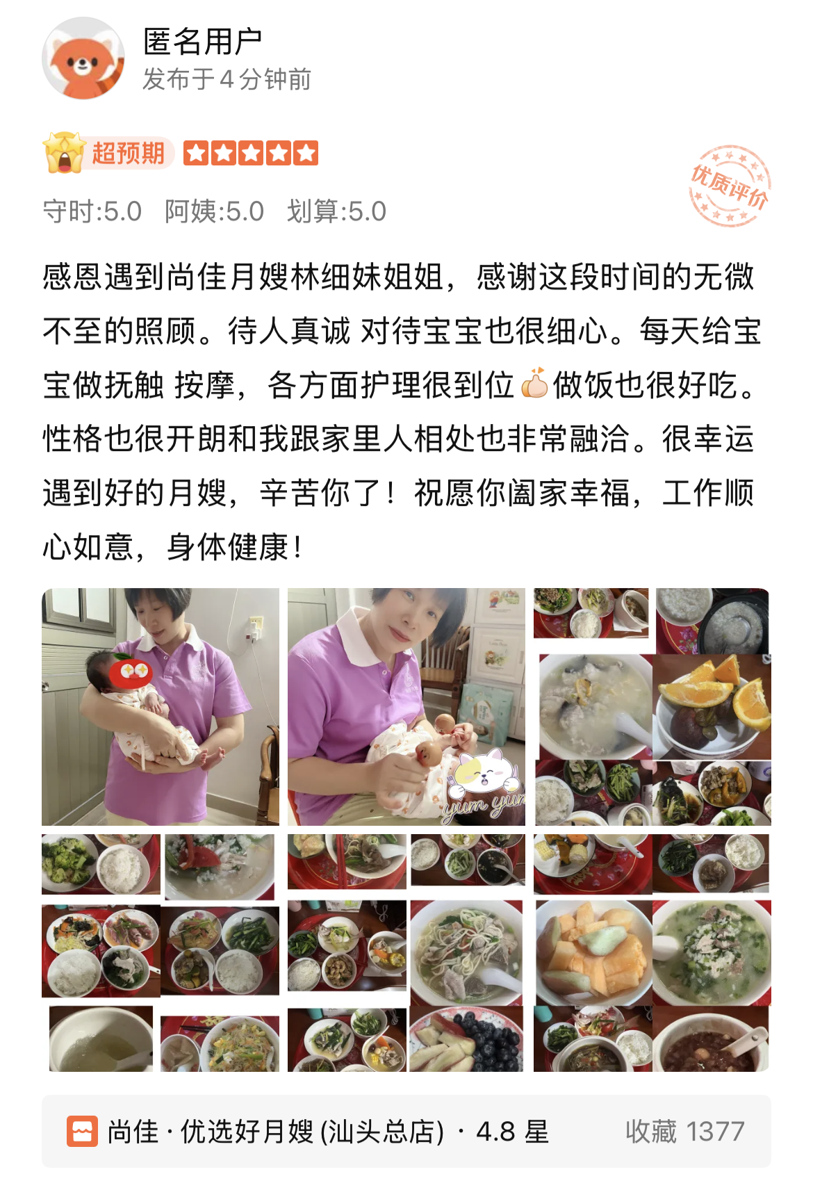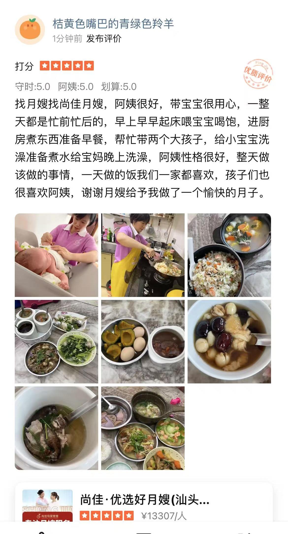 細(xì)妹來自汕頭,積極向上,做事勤快,一直在尚佳從事月嫂行業(yè),做到盡心盡力服務(wù),并無一投訴,無一差評(píng),對(duì)待寶寶如同自己孩子,對(duì)寶媽的護(hù)理也是細(xì)心貼心,對(duì)待寶媽家里人也是熱情開朗,做事認(rèn)真負(fù)責(zé),踏實(shí)肯干。